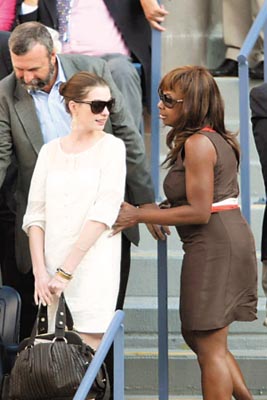 接连出席完威尼斯与多伦多电影节的安妮·海瑟薇(左)又马不停蹄地出现在美网决赛场边。