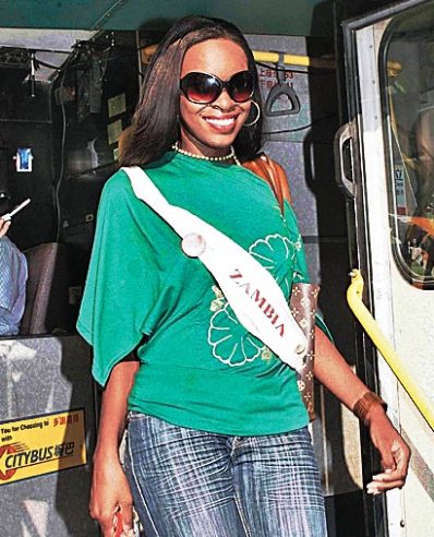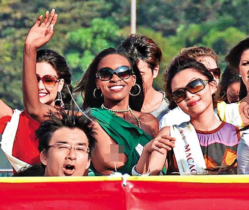 大会昨午安排33号至63号佳丽参观大屿山宝莲寺,原定之后再到青马大桥,但因时间延误而取消。佳丽昨午先由将军澳电视广播城乘开篷巴士前往东涌,然后再乘专车参观大佛。为一览香港迷人景致,佳丽纷纷走上巴士上层。沿途清风送爽,佳丽兴奋得不停跟记者挥手打招呼,但风势越来越猛烈,穿上大圆领T恤的赞比亚佳丽63号Chipo Mulubisha,忘形地跟记者挥手打招呼之际,她阔阔的袖口位竟被猛风吹到移位,结果真空上阵的她不慎露出整个右胸。另外,有部份佳丽则被大风吹到头晕而要吃话梅止呕。