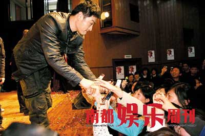 黄维德在舞台上尽显偶像风采,中途更深入到群众中去,和大学生握手互动,做男人难,做“小三男”其实不难。
