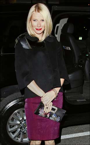 好莱坞高雅美女格温妮丝·帕特洛一向都是美国高贵女性的穿衣典范,昨日(2月26日)一袭黑色毛绒高贵毛绒上衣,配紫红色高雅裙子,金色短发烈焰红唇,与以往性感女星不同,格温妮丝·帕特洛展示的是高贵优雅。 而全是搭配的点睛之笔就是闪亮手包。