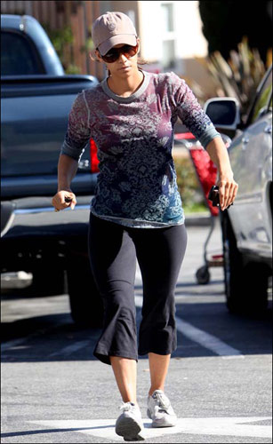 奥斯卡影后哈莉·贝瑞最近一身休闲运动装扮亮相街头,头带蓝色棒球帽,配黑色大墨镜,明星范不减,加上印花七分袖上衣,蓝色七分裤,健康性感。看来我们也需要多多运动哦。