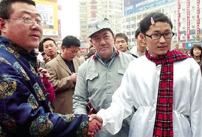 随后,“小沈阳”、“李云龙”携手漫步二七广场,市民伴随左右,越聚越多,致使二七广场北侧唯一的行车道一度堵车。接着,“范伟”也放下生意,和两人一起走到南顺城街。“小沈阳”说,他要带“李云龙”去紫荆山公园等处转转。