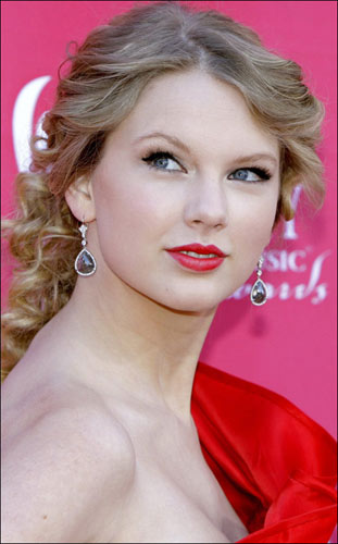 泰勒·斯韦福特,一袭红色及地礼服,斜肩设计,露出白嫩的肩膀,整个人嫩白如雪,娇媚无比。