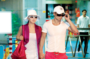 前晚11点,记者在首都机场看到演员赵文卓夫妇走出机场大厅。赵文卓戴白色帽子、黑色墨镜,穿白色紧身T恤、粉色短裤,系粉色腰带,而一旁的妻子张丹露也是粉白色系搭配,两人明显是情侣装搭配。