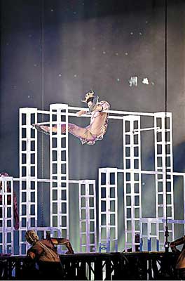 中新网9月1日电 郭富城前晚于澳门举行首站的世界巡回演唱会,更穿上火红闪闪“爱的战衣”新装载歌载舞。当他在架上表演体操环节时,因绊脚险堕下台,幸好自言孔武有力的他,用力支撑身体,继续表演。