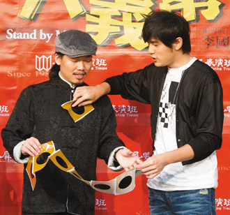 好友方文山(左)初试舞台剧,周杰伦(右)昨天亲自到场加油打气,并赠跌打损伤膏药当礼物。