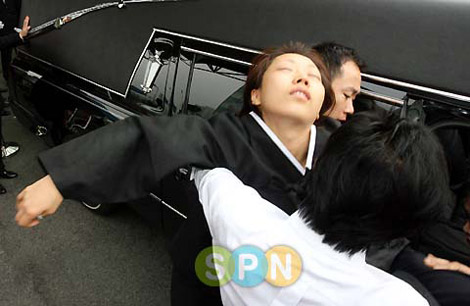 演员安在焕的出殡仪式于11日早晨8时在首尔江南圣母医院殡仪馆举行,妻子郑善姬再次晕倒,令现场人员难过万分。(图片来源:Edaily SPN)