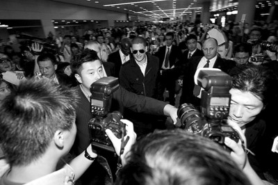 昨天,米勒穿着一件黑色的短风衣,内里白色的翻领T恤随意地敞着领口,黑色的墨镜,然后带着他标志般的笑容,在四名皇家级保镖的护卫下,走入了汹涌的人群。