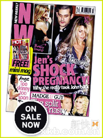 最新出版的澳大利亚媒体《NewWeekly》爆料:詹妮弗·安妮斯顿之所以吃回头草,同前男友约翰·梅耶再续前缘,是因为她已经怀了对方的孩子!该期杂志的封面是上周四两人一起离开日落塔酒吧时被拍到的照片。