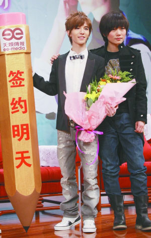 “我现在也没有多少钱,希望签约天娱以后让我有更多的钱。”这话出自刚刚以1300万元版税收入雄踞2008年作家富豪榜冠军的郭敬明之口。昨天下午,他正式和天娱签约进军娱乐圈,加盟天娱之后的他将担任天娱的文学总监和新成立的影视制作部创作总监,而天娱旗下艺人陈楚生和许飞也赶来为“师弟”站台。