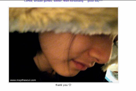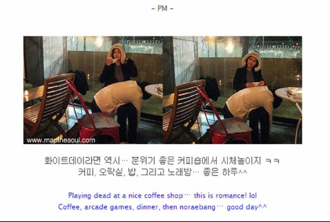 Tablo在上传照片后,还写了照片说明。他写到:“白色情人节,理应在气氛浪漫的咖啡屋装出死人的样子,呵呵,咖啡、娱乐室、吃饭,还有练歌房,快乐的一天^^。”回顾了当时幸福的样子。