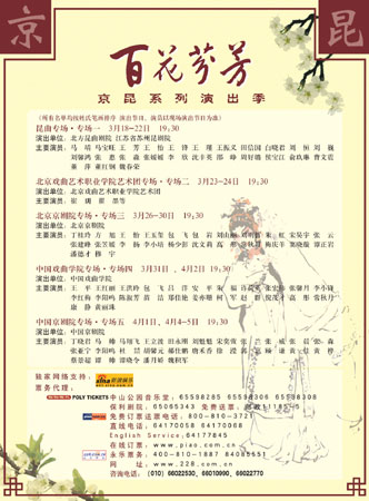 此次京昆演出季剧目均为京昆艺术中的令人耳熟能详的传统剧目,还特意安排了唱段、折子戏和整出大戏三种演出形式,喜爱昆曲的观众既可以完整地欣赏到整出的《牡丹亭》、《西厢记》等昆曲名剧,也可以见到《佳期》、《夜奔》等昆曲一折,还可以听到《雾失楼台》等经典昆曲唱段;喜爱京剧的观众既可以完整地欣赏到整出的《四郎探母》、《赵氏孤儿》等京剧名剧,也可以见到《状元媒》、《赤桑镇》等京剧一折,还可以听到《锁麟囊》、《红娘》等经典京剧唱段。