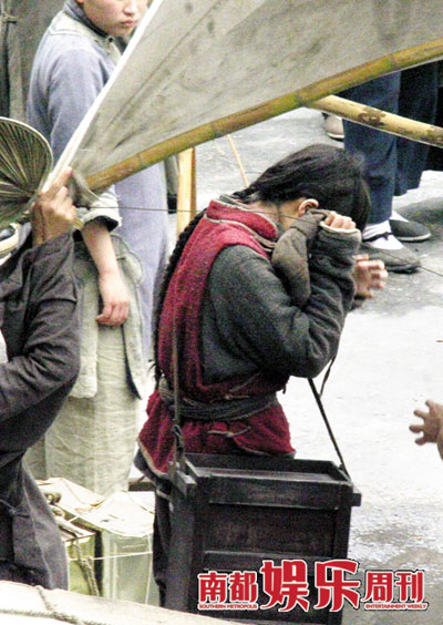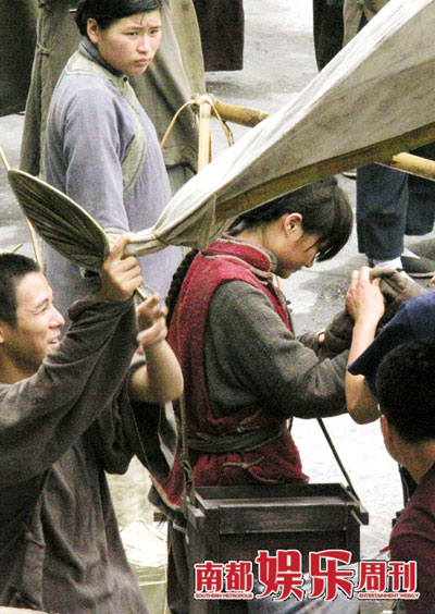 这是李宇春第一次拍电影,还碰到这么多的明星大腕、前辈高人,说没压力也不可能。片场休息,李宇春很少笑,总是坐在黄包车里一个人孤零零地想问题。导演一喊开机,不管有戏没戏,她都会站到路边仔细看。没想到路边也不安全,一阵邪风吹倒一个雨棚,棚倒杆折,一下子就砸到李宇春的头上。好容易从雨棚下挣扎出来,脑袋上不免起了个“包”,吓坏了周围的助理们,围上去揉了半天,所幸并无大事。李宇春揉了揉脑袋,倒露出了一丝轻松的笑。记者 秦耀辉