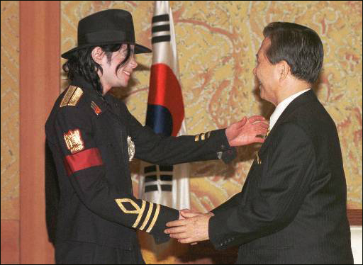 韩国前总统金大中与迈克尔·杰克逊在一起。1998年2月,迈克尔参加了韩国金大中总统的就职仪式。