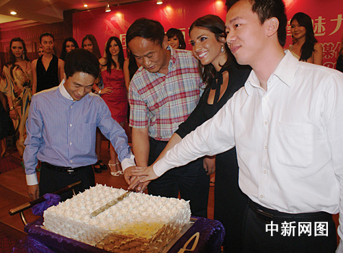 参赛佳丽与主办方代表共切代表“国际美丽小姐”35岁生日的蛋糕