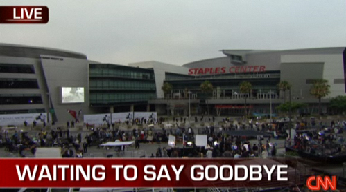 中新网7月7日电 根据CNN现场报道,大量歌迷开始聚集在斯台普斯中心前等待杰克逊的悼念仪式。