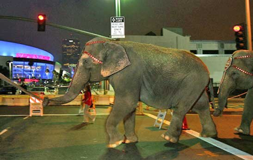为了杰克逊追思会,参加游行的11头大象,7匹马,老虎,斑马,小马和狗被存放在洛杉矶斯台普斯中心后台5天,
