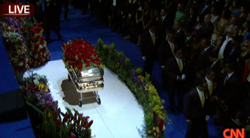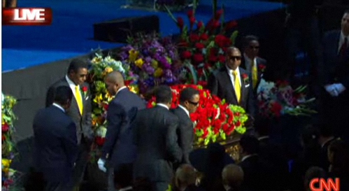 中新网7月8日电 CNN消息,杰克逊棺木已经运达追思会现场,杰克逊遗体在其父亲和兄妹的陪伴下已放置于会场中央。