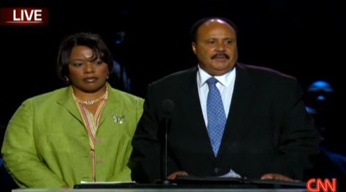 中新网7月8日电 CNN消息,马丁.路德.金后代在杰克逊公众悼念仪式上向杰克逊致辞。