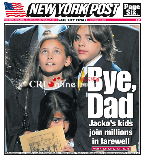 2009年7月9日讯,洛杉矶,当地时间7月7日,流行音乐之王迈克尔·杰克逊(Michael Jackson)的公众悼念仪式在美国洛杉矶的斯台普斯体育中心举行。当地时间7月8日,《纽约邮报》把杰克逊三遗孤的合影当做封面,孩子们泛红的眼圈,哀伤的神情令人心酸。