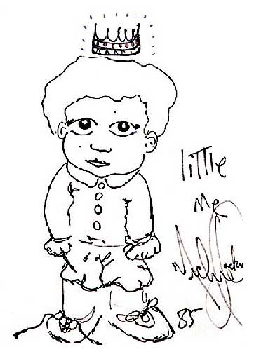 3张自画像中,其中一张是MJ自绘儿时的样子,图中他身材细小头发鬈曲,头戴皇冠十分可爱。