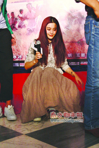 范冰冰当天身穿可爱裙子亮相,近日为了宣传新片,她转战多处,疲惫不堪,在酒会上接受采访时,她竟然豪放地忽然蹲下,特立独行,长辈演员和导演何平都不禁低头看她。