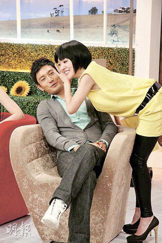 小S热情地在黄晓明耳边悄悄说话,令他即时面红闪避。