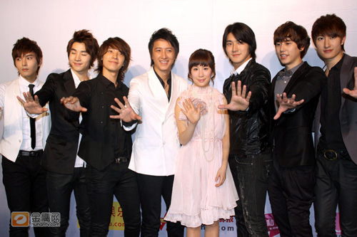 由中国成员韩庚率领的韩流花美男组合super junior-m以及他们的同门师妹张力尹近日分别推出了迷你专辑《Super Girl》和单曲专辑《晴天,雨天》。在北京举行的专辑发布会上,SJ-M演唱了新碟中的经典情歌《到了明天》,将台下的“妖精”们迷醉的如痴如狂。M成员李东海和张力尹在MV中的甜蜜合照令未能参加拍摄的韩庚和崔始源着实羡慕不已,之后竟当场模仿起了其中的经典片段,状况百出,惹得台下笑声一片。而在之后的环节中,韩庚更是亲手为好兄弟涂上唇膏,并将其赠送给被抽中的幸运粉丝,令其他歌迷羡慕不已。