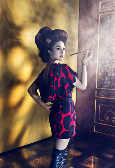 日前,范冰冰登上11月《虹Madama Figaro》杂志封面,为配合本期Femme Fatale(致命的女人)的主题,拍摄了这组色彩浓丽的大片。她手执长烟管,慵懒吐出烟圈,修长的脖颈,如白瓷般的削肩,姿势嚣艳已极,造型之奇巧,深得欧洲宫廷复古风真味。