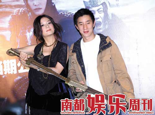 《花木兰》发布会,赵薇与房祖名舞刀弄剑。