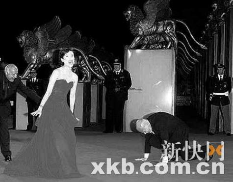 第63届威尼斯电影节,章子怡身着大红拖地低胸长裙亮相,电影节主席"下跪"迎接章子怡
