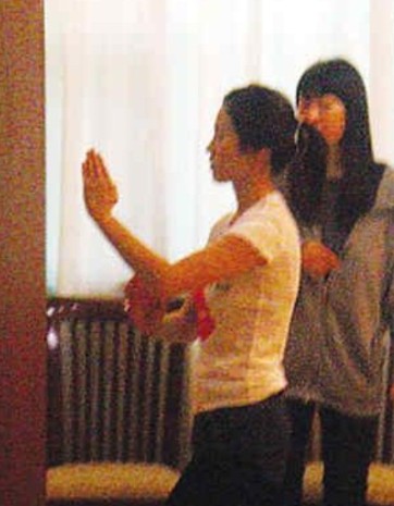 就在乔妹练功当日,居然还撞到了也在此地封闭训练的张震。只见张震戴着一顶棒球帽,身穿灰色的迷彩短袖T恤,一看也是准备要去练功的架势。而两人一见面,就马上热络地攀谈起来,有说有笑之余还比划起一些武术动作,似乎是在交流练功心得。