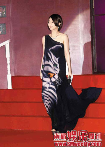 范冰冰以Salvatore Ferragamo 09春夏豹头印花雪纺长裙出席《非常完美》发布会,飘逸的质地非常适合初夏。厚底水台高跟鞋将原本高挑的身材修饰得更为纤细,简约的发型相当清爽。