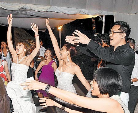 因为现场有乐队演奏快歌,在主持人张智成的带动下,梁静茹、Tony领军到舞池跳舞,随后贾永婕也带着2个女儿下场跳,戴佩妮顾虑男友西米露的腰伤,上场没多久就回座陪男友;新娘子情绪亢奋,索性撩起裙摆拉妈妈及公婆进舞池,梁妈妈也在舞池忘情地扭动,梁静茹则数度与Tony深情相拥,最后被拱唱《Just the way you are》时,她还开玩笑说:“今天不收商演价喔!”