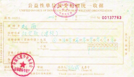 赵薇的经纪人陈蓉回复说:“欢迎监督,欢迎核查!”她透露:“除了这10万元赵薇是有捐款凭证的,另外赵薇还捐款50万元给中国儿童少年基金会用于在德阳兴建赵薇抗震春雷学校。”