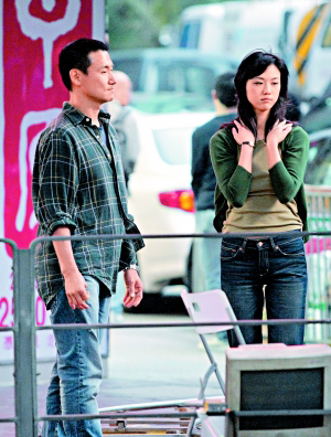 张学友和汤唯的一场街头戏,汤唯正在生闷气。