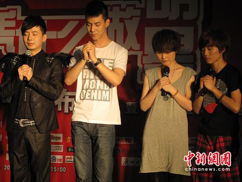 左起陈子嘟、张殿菲、厉娜、许飞现场为玉树灾区祈福。