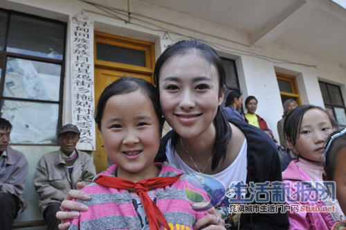 当天,兽兽化了淡淡的妆,扎了一根俏皮的马尾辫,身着休闲的运动服,完全一副在校生的模样。从昆明出发到寻甸县柯渡镇,差不多3个小时的车程。半路休息时,兽兽嚷着要吃烤土豆、煮玉米,还大赞“太好吃了”!小女孩儿性格展露无疑。三个多小时后,到达目的地后,除了和他们互动,兽兽还帮一个小女孩系起了红领巾。