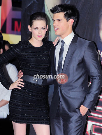 中新网6月4日电 据“朝鲜日报”消息,3日,吸血鬼题材的电影《暮光之城》系列的主人公克里斯汀·斯图尔特和泰勒·洛特纳赴韩宣传,为新片《暮光之城3:月食》宣传造势。图为两位主演当晚出席了在首尔某影城举行的粉丝见面会。