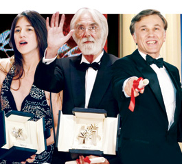 值得一提的是,67岁的哈内克正是今年的评委会主席、法国女演员伊莎贝尔·于佩尔的恩师。于佩尔8年前曾在哈内克执导的影片《钢琴教师》中担任主演,并斩获戛纳电影节影后桂冠。充满“黑色镜头”的《白丝带》今年在戛纳首映后赢得媒体一片叫好,“举贤不避亲”的于佩尔最终力挺该片获大奖。当她亲自为白发苍苍的哈内克献上“金棕榈”奖杯之后,两人还在台上深情相拥。