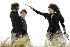 《哈利·波特》系列电影的第七部——《哈利·波特与死亡圣器》,目前正在英国彭布鲁克郡热拍。扮演女魔头贝拉特里克斯的英国女演员海伦娜·邦汉·卡特出现在了片场,这个在第五集《哈利·波特与凤凰社》开始登场的坏蛋,难得出现在外景中,她将与哈利三人组进行更激烈的对抗。在拍片现场,“哈利”丹尼尔·雷德格里夫和“赫敏”艾玛·沃森也都高调亮相。