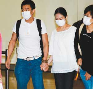 晚10时半左右,刘、朱飞抵香港,上百媒体及fans“急扑”机场一探究竟。当闸口打开,遭媒体围攻的华仔不愿松开朱丽倩的手并一起步出机场,为保护朱丽倩不被人群撞倒,华仔更腾出另一只手搂着朱丽倩,二人寸步不离,非常恩爱。接着,华仔与朱丽倩在几名保安及警员保护下匆匆离开,不过由于场面极度混乱,其间不时有人跌倒及出现掉鞋子的状况。