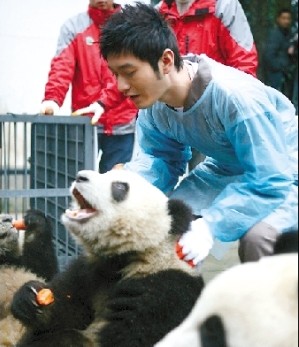 昨日,由卧龙中国保护大熊猫研究中心精心遴选的10只大熊猫,从该中心雅安碧峰峡基地启程前往助阵上海世博。作为“中国保护大熊猫研究中心熊猫爱心大使”的黄晓明,同时又是成都和雅安的熊猫爱心大使,以及上海世博会志愿者宣传大使,特意向剧组告假赶到雅安现场。此行他不仅是为了宣传保护大熊猫和世博,最重要的是为了来替自己的一双“儿女”送行。原来由他出资百万元认养的地震后出生的全球首对双胞胎大熊猫“平平”、“安安”这次就将以“哥哥”、“姐姐”的身份带领另外8只熊猫远赴上海世博。(春城晚报)