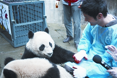 1月5日,“中国保护大熊猫研究中心熊猫爱心大使“黄晓明到雅安现场,替自己的一双“儿女”送行。由他百万认养的地震后出生的全球首对双胞胎大熊猫“平平”、“安安”这次就将以“哥哥”、“姐姐”的身份带领另外八只熊猫远赴上海世博。“平平”似乎一眼就认出了“爸爸”,边吃着早餐,另一只手很自然的就搭在了黄晓明的腿上。 记者 黄丽娟