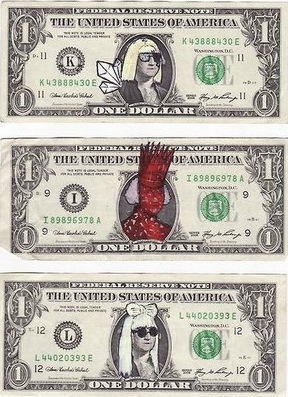 据悉,此次将乔治·华盛顿的1美元钞票换成lady gaga肖像的行为,是美国一画家克里斯·格里森(Chris Gleason)杰作。他将1美元钞票里,原来乔治·华盛顿的头像,直接修改成了lady gaga经典造型,并分出多个版本。此外,画家克里斯·格里森还将这12张为一组“伪造”的lady gaga1美元钞票,放到网上出售,售价为15美元。