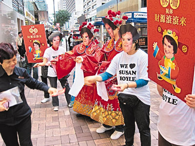 至于香港的苏珊大妈粉丝也不甘示弱,近日戴起面具兼穿上“爱珊Tee”向途人大派“苏珊财神”,代偶像祝港人今年财源滚滚。有关方面也推出了贺年新春限量版CD应节,附送苏珊“心想事成”红包10个,以配合唱片主题“我有个梦想”。