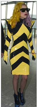 据台湾媒体报道,美国女星LadyGaga近日出现在伦敦机场时,竟穿着活像交通标志的黄底黑条纹洋装一件,很显然她决定要自己为自己开道,以减少不必要的支出。