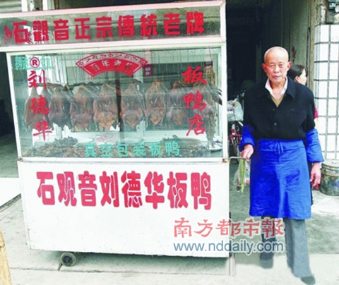 据悉,观胜镇卖板鸭的有几十家,每一家多用店主名字注册作为招牌。而刘老伯在1980年已创立以自己姓名命名的板鸭店,2004年申请“刘德华牌板鸭”注册成商标,2007年申请成功。