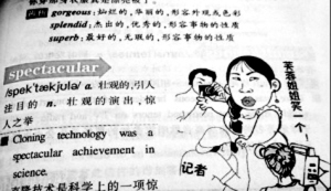 不少网友对此表示:“看看漫画中芙蓉姐姐面对话筒的形象,用来解释‘spectacular’是相当贴切的。这其实也符合《新概念英语》这套教材的整体个性,因为与传统的教材相比,这本‘英语宝典’本来就很潮。”