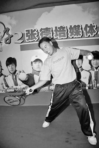 上世纪90年代中期,那时的张德培在网球界可谓如日中天。昨天的他换上演员身份,却非常低调,一件看上去有些廉价的灰色T恤随意地塞在运动裤里,头发也不如当年拍广告般黑亮飘逸。发布会开始前,记者们就站在他身后,还四处张望,“张德培呢?怎么没来?”
